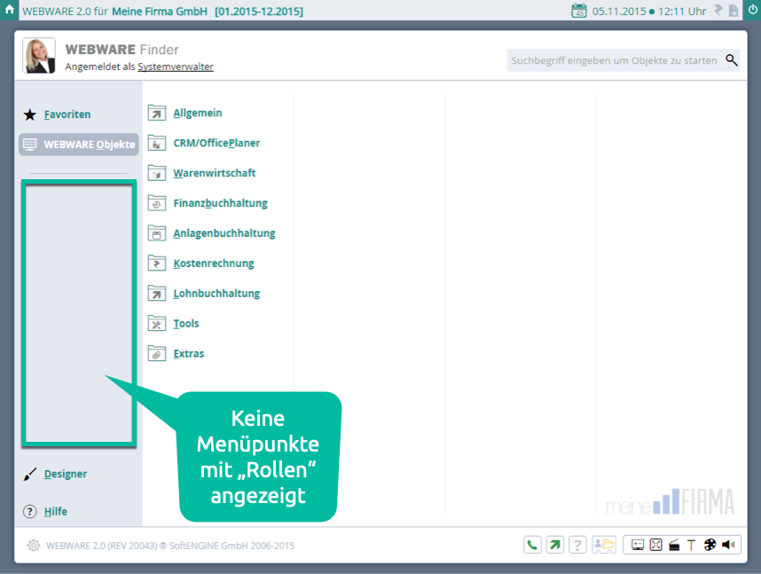 Hiermit kann die Rollen-Verwaltung im WEBWARE-Finder deaktiviert werden. Damit werden dann keine Menüpunkte mit Rollenbezug im WEBWARE-Finder angezeigt.
