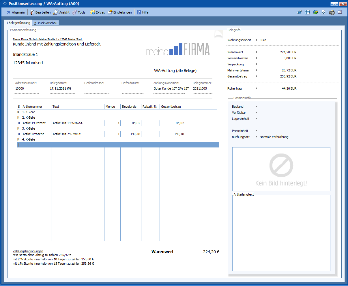 Ausgangsdokument „Auftrag“ mit K-Zeilen: