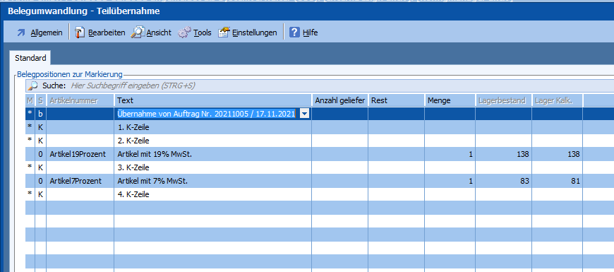 Nach Start der Teilwandlung sind die K-Zeilen automatisch markiert (das lässt sich anhand des „*“ erkennen) und werden somit in den neuen Beleg übernommen: