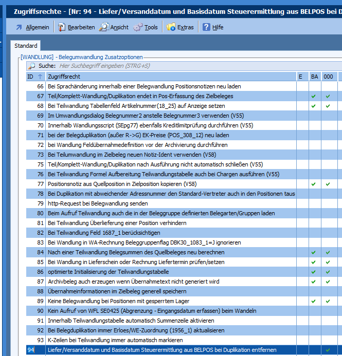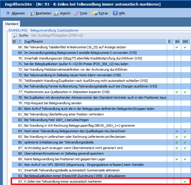 Mit dieser Programmänderung gibt es das neue Zugriffsrecht „WANDLUNG,093 – K-Zeilen bei Teilwandlung immer automatisch markieren“. Wenn das Zugriffsrecht aktiv ist, werden alle K-Zeilen aus dem Quellbeleg bei einer Teilwandlung automatisch markiert.