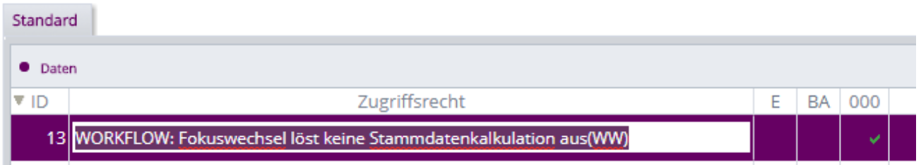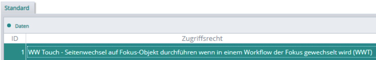Mit diesem Zugriffsrecht WEBWARE_TOUCH,1 „WW Touch – Seitenwechsel auf Fokus-Objekt durchführen wenn in einem Workflow der Fokus gewechselt wird (WWT)“ kann im WEBWARE-Touch-Modus das Verhalten beim Fokus-Wechsel innerhalb von Workflows beeinflusst werden.