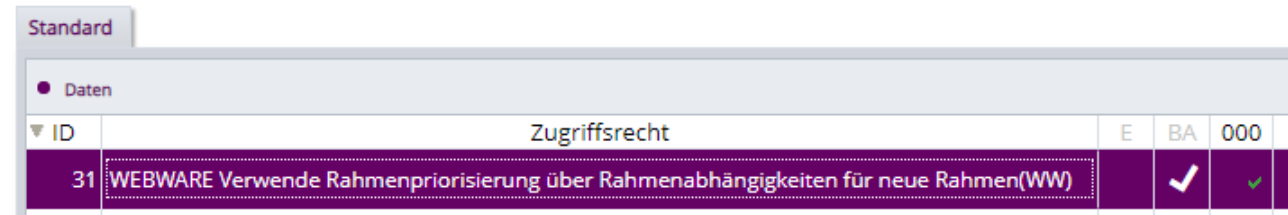 Mit diesem Zugriffsrecht, welches im Standard aktiviert ist, wird die interne Priorisierung von neuen Rahmen über ein korrigiertes Modul durchgeführt. Dies löst verschiedene Probleme, z.B. dass in der Belegerfassung die Text-Rahmen bei der Erstellung, bzw. Erstaufruf, nicht gefüllt wurden.Â