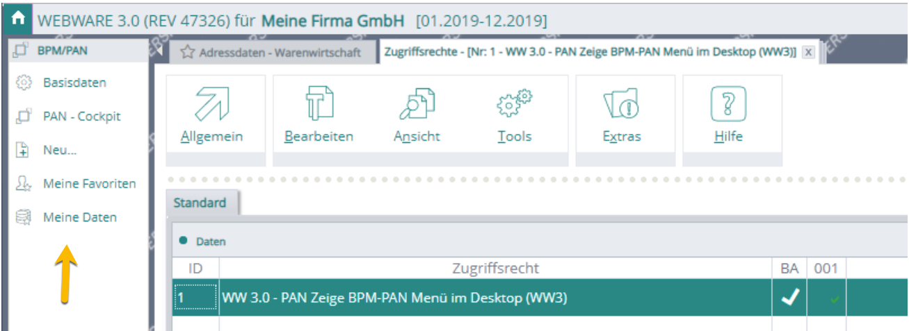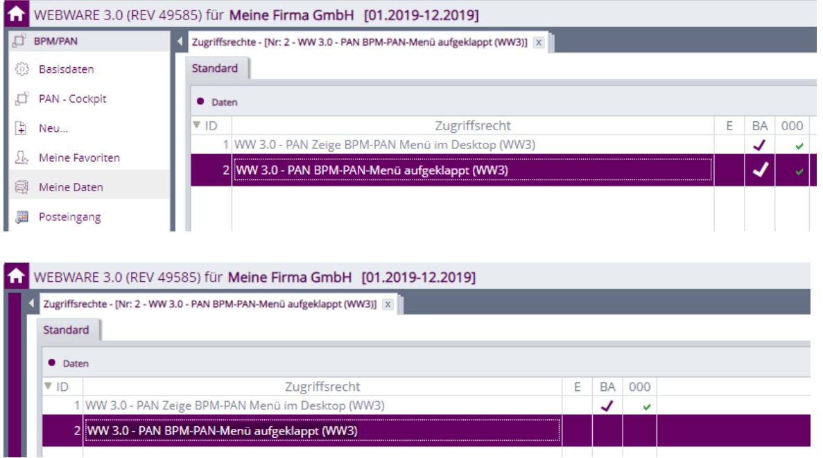 Um das neue PAN-Menü ein- und ausblenden, bzw. steuern zu können, wurde das Zugriffsrecht WEBWARE_30,1 „WW 3.0 – PAN Zeige BPM-PAN Menü im Desktop“ eingeführt.Â