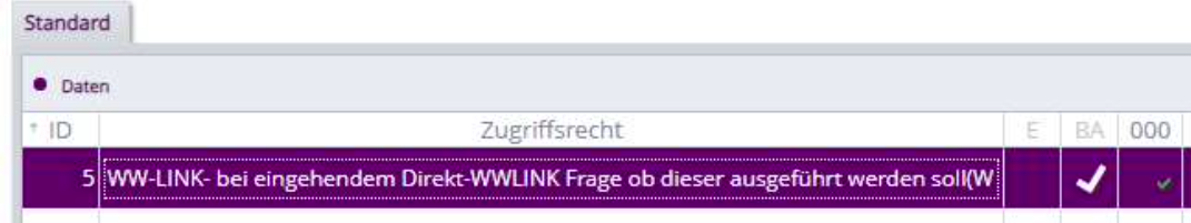 Damit der Benutzer entscheiden kann ob er die Verarbeitung des Direkt-WWLINK durchführen will, gibt es ein Zugriffsrecht, mit sich die Abfrage zur Verarbeitung des Direkt-WWLINK an/abgeschaltet lässt. Damit ist es möglich, dass der Benutzer in den Ablauf der Verarbeitung eingreifen kann.