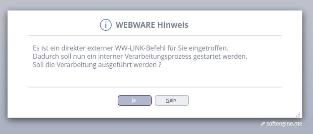 Dieser Systemwert ist im Auslieferungszustand aktiviert, so dass bei Eintreffen eines Direkt-WWLINKS der Benutzer die folgende Meldung zur Auswahl angezeigt bekommt: