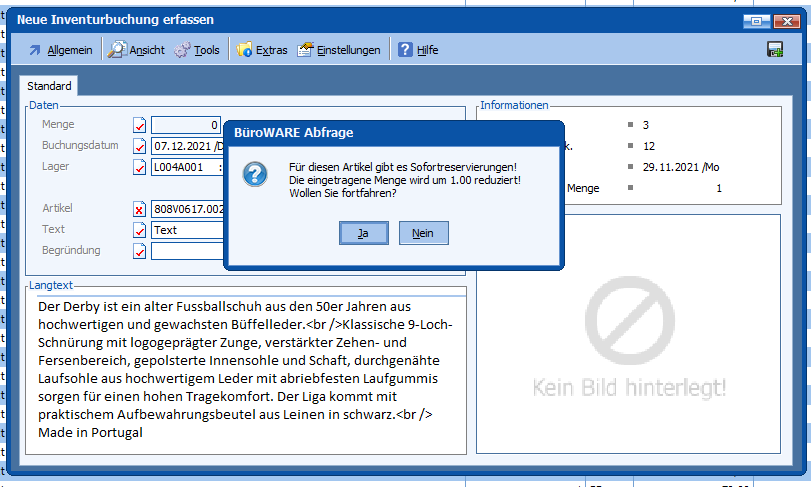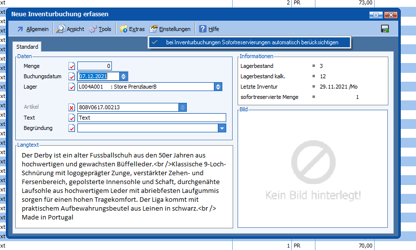 Sollte eine Nullbuchung für einen Artikel gemacht werden und es noch Sofortreservierungen geben, werden diese automatisch mit berücksichtigt.