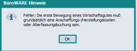 „Die erste Bewegung eines Wirtschaftsgutes muß grundsätzlich eine Anschaffungs-/Herstellungskosten oder Alterfassungsbuchung sein.“