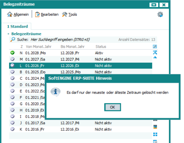 In der erweiterten Belegzeitraumverwaltung lassen sich einfach neue Zeiträume anlegen und auch löschen. Standardmäßig ist hierbei nur das Löschen des ältesten oder neuesten Zeitraums erlaubt. Der Versuch, einen „Zwischenzeitraum“ zu Löschen wird von der Software abgelehnt.
