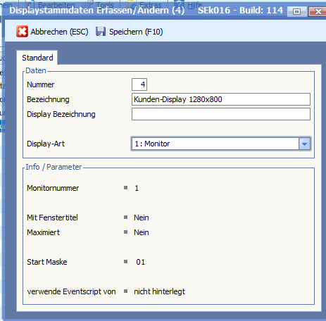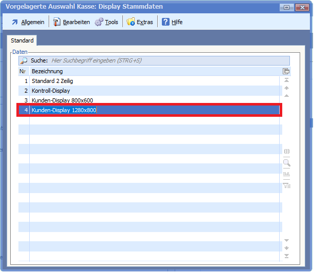 Mit dieser Programmänderung stehen nun Grafiken für das Kundendisplay in der Auflösung 1280×800 zur Verfügung. Hierzu finden Sie in den Display Stammdaten bei den Kassen Basisdaten einen neuen Eintrag.