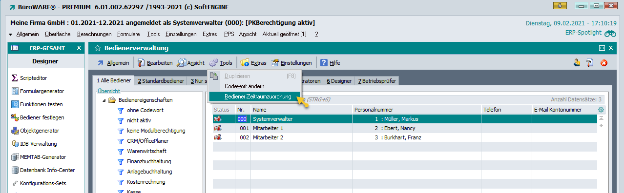 In der Bedienerverwaltung unter „Tools“ gibt es ein neues Tool, um die Zeitraumzuordnung aller Bediener für die aktuellen Mandanten zu ändern.