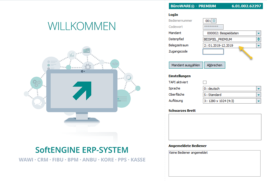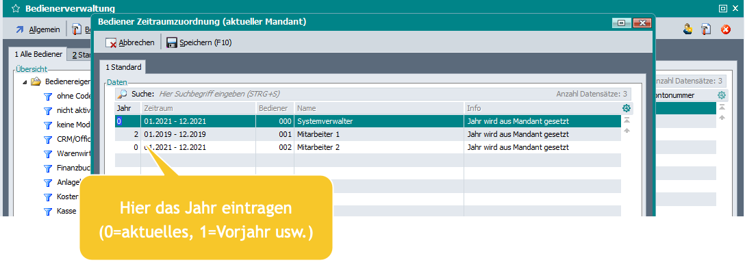Der hier eingestellte Zeitraum ist ab nächstem Login für den jeweiligen Bediener aktiv (im Screen zu sehen, beispielsweise das Vor-Vorjahr).