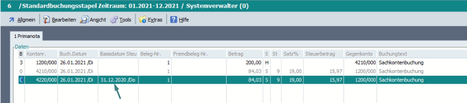 Bei Sachkontenbuchungen wurde, sofern gesetzt, das Basisdatum Steuerermittlung als Buchungsdatum verwendet.