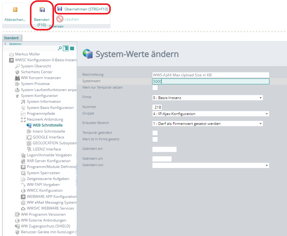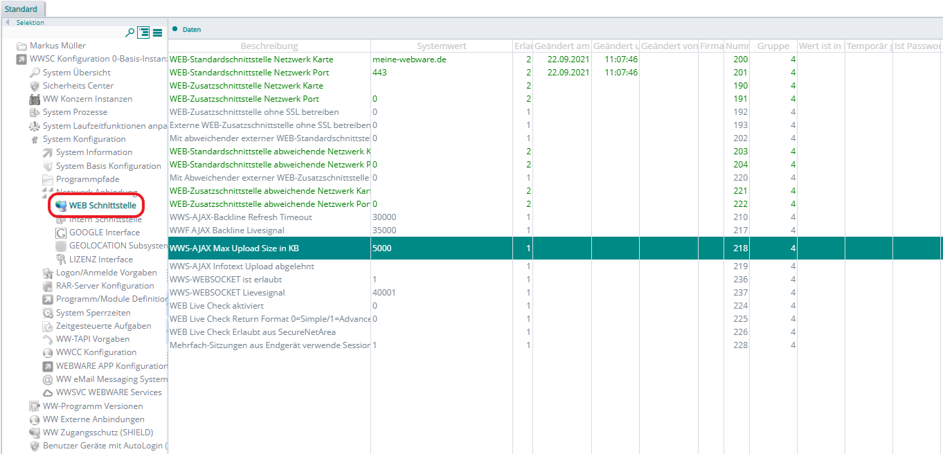 Wechseln Sie danach in des Untermenü System Konfiguration– Netzwerk Anbindung – Web Schnittstelle und öffnen hier den Punkt WWS-AJAX Max Upload Size in KB