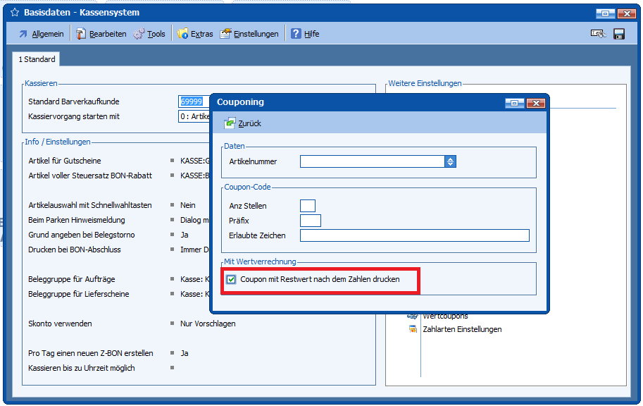 Hierzu gibt es in den Kassenbasisdaten unter Couponing die Option „Coupon mit Restwert nach dem Zahlen drucken“.