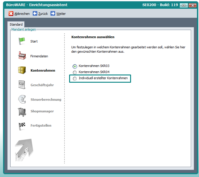 Die Auswahl „Individuell erstellter Kontenrahmen“ wird nur noch dann angezeigt, wenn tatsächlich ein Individueller Kontenrahmen mit dem Namen FIBINDIV_V51.DEF zur Installation im BüroWARE Verzeichnis zur Verfügung steht. Neu ist, dass dieser Kontenrahmen auch tatsächlich installiert wird.