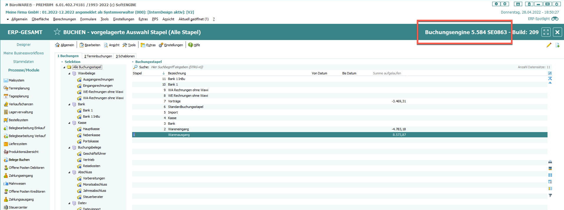 Diese Buchungsengine wird aktuell in allen Versionen der SoftENGINE ERP eingesetzt und seit dem Testat nicht geändert (Siehe Screen) Vectoring.