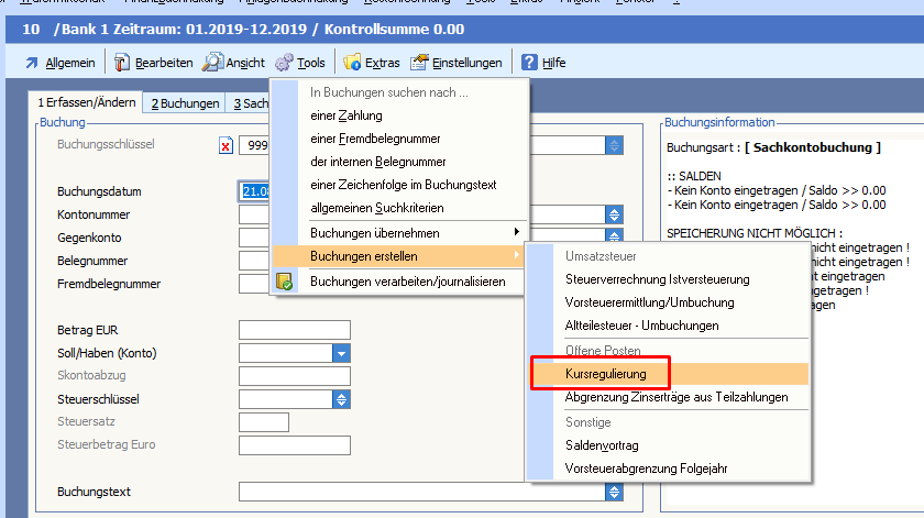 Ist dieses Recht aktiviert und wird das Sachkonto der Bank, welches im Bankenstamm hinterlegt ist, in Fremdwährung geführt,