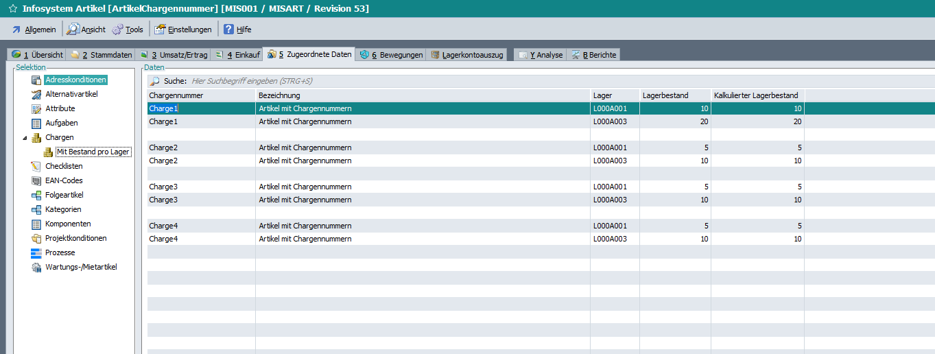 Mit der Revision 68845-Beta wurde die Ansicht im Infosystem „Artikel“ auf der Karteikarte „Zugeordnete Daten“ für die Chargen um einen Ast-Eintrag ergänzt.