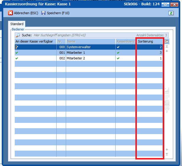 Mit dieser Programmänderung kann eine Sortierung der Kassiererauswahl festgelegt werden. Dazu gehen Sie in den Kassenstammdaten zu den Kassiererzuordnungen. Dort gibt es in der Tabelle eine neue Spalte „Sortierung“. In dieser Spalte legen Sie Ihre Sortierreihenfolge für die Kassiererauswahl fest.