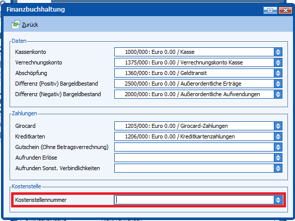 Die Kostenstelle wird unter „Finanzbuchhaltung“ in den Kassenstammdaten hinterlegt.