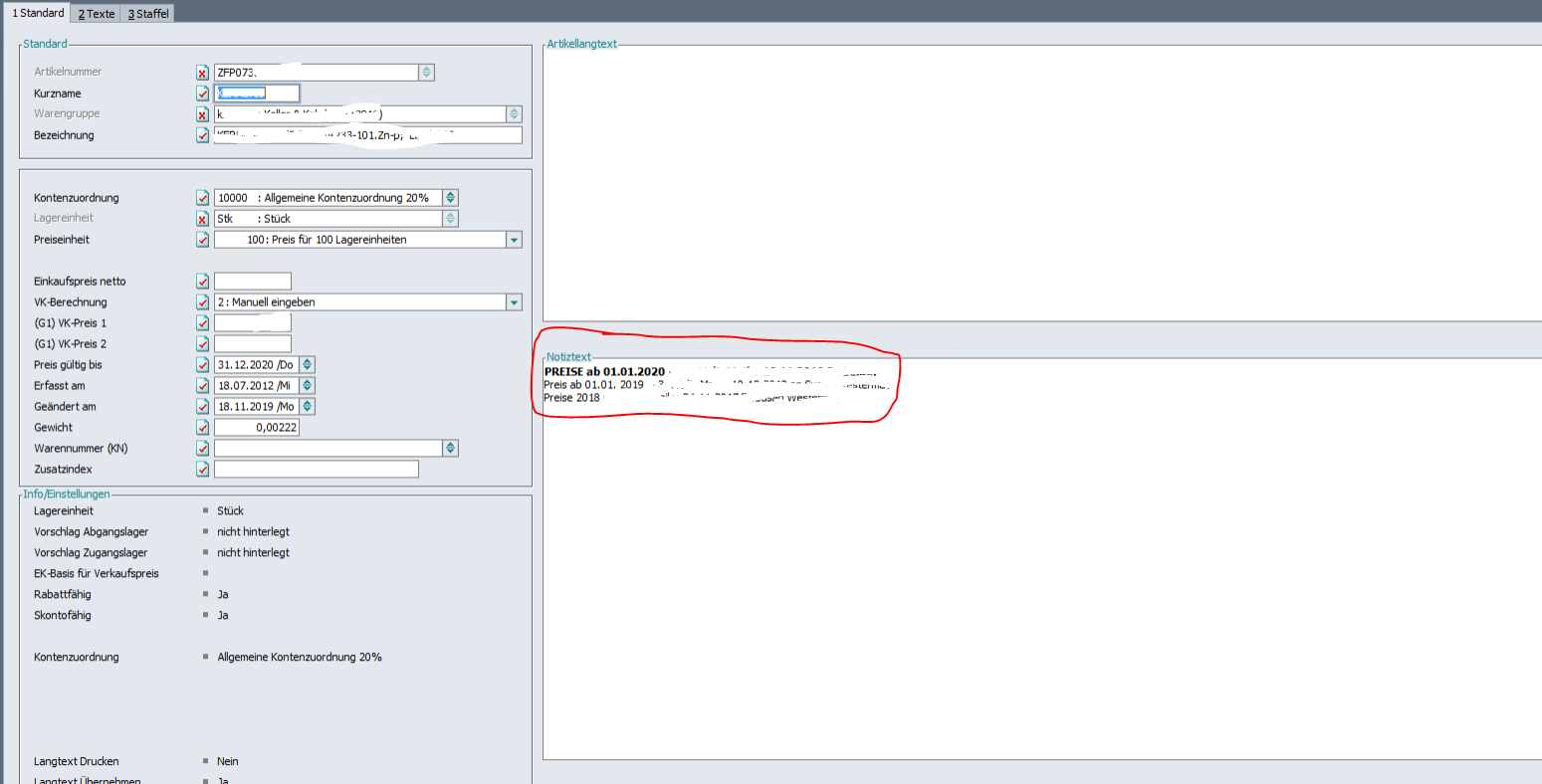 der Notiztext des Artikels in das Attribut A4 der Zeile geladen. …