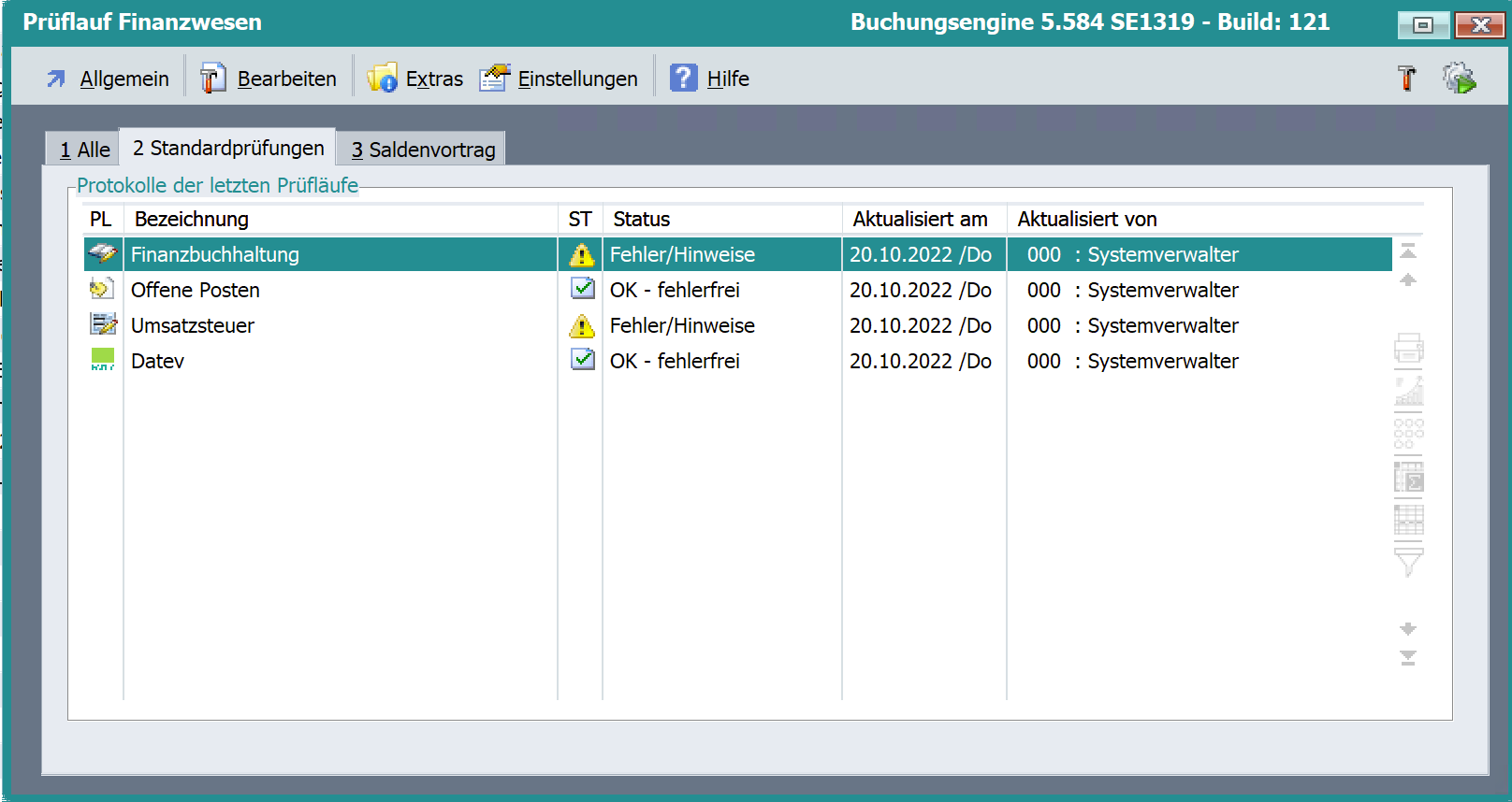 Im Prüflauf der Finanzbuchhaltung werde sowohl Fehler erkannt, wie auch Hinweise zu Vorgängen angezeigt.