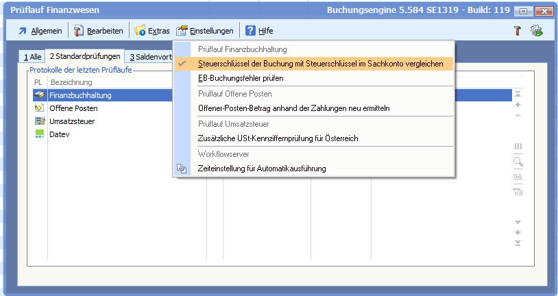 In der Finanzbuchhaltung, in der vorgelagerten Auswahl der Stapel, wird unter Extras der Prüflauf Finanzwesen aufgerufen.