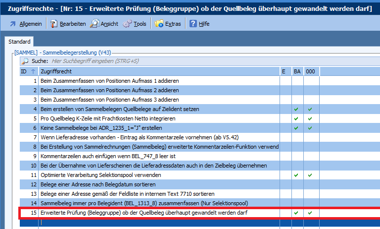 Mit dieser Programmänderung gibt es ein neues Zugriffsrecht, das prüft, ob der Quellbeleg gewandelt werden darf. Das Zugriffsrecht prüft dabei, ob das Feld 1594_1 in der Beleggruppe = „J“ ist.