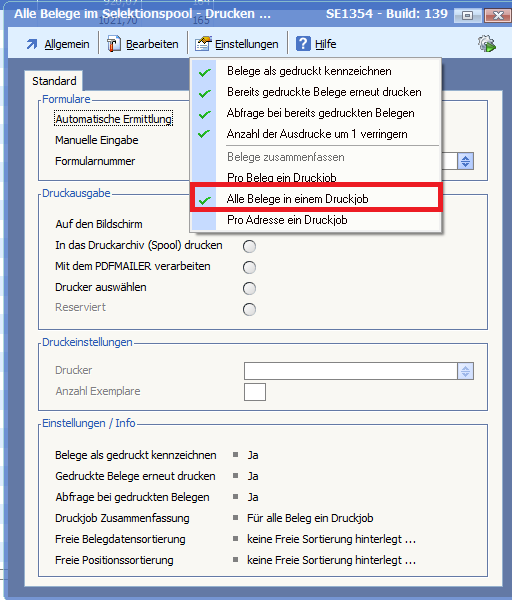 Mit dieser Programmänderung gibt es drei einstellbare Arten, wie man beim Ausdruck aus dem Selektionspool Belege zusammenfassen kann.