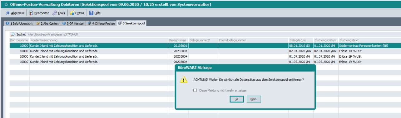 Sofern man in der Offenen Postenverwaltung auf Karteikarte „5 Selektionspool“ unter Tools > Aus Selektionspool entfernen > Alle Offenen Posten ausgeführt hat, ist nichts passiert und die OPs waren weiterhin im Selektionspool vorhanden.