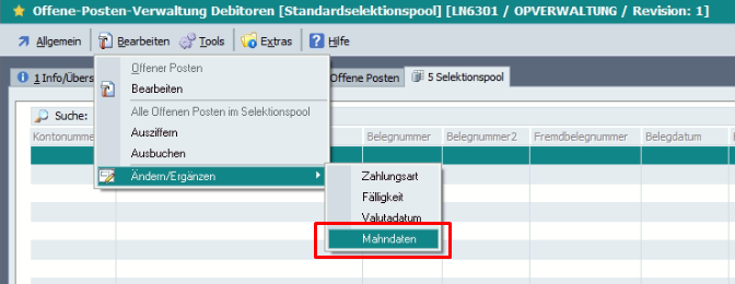 Ab Revision 56612/BETA und 56610/PATCH gibt es in der Offenen Postenverwaltung der Debitoren im Selektionspool die Möglichkeit Mahndaten zu ändern.