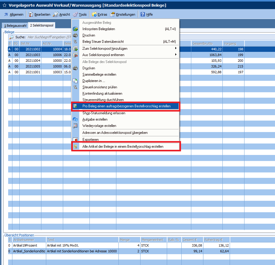 Zusätzlich steht Ihnen die Erstellung eines Bestellvorschlages für Alle Artikel aus dem im Selektionspool befindlichen Belegen zur Verfügung.