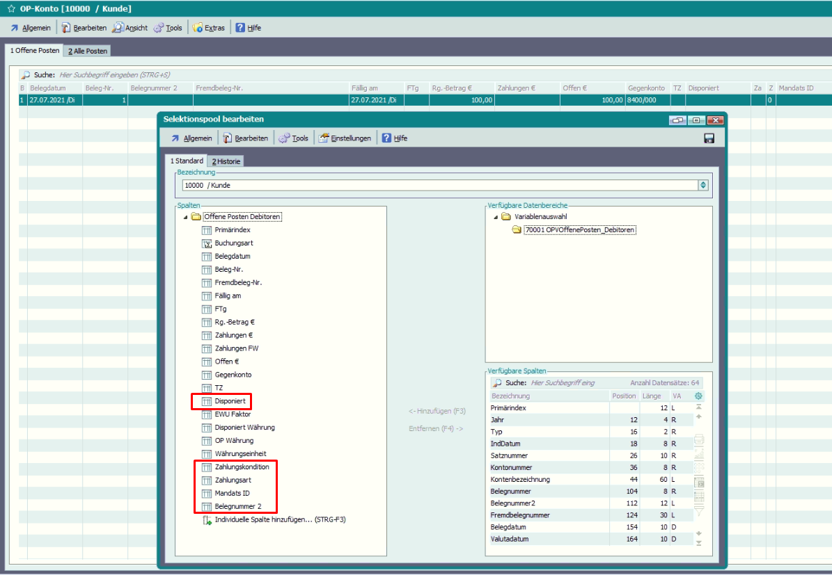 Im Selektionspool kann mit SPF_xx_yy auf vorher individuell erstellte Spalten in der Zuweisung zugegriffen werden. Hierbei muss jeweils die Position und Länge der individuellen Spalte aus den Feldeigenschaften angegeben werden.
