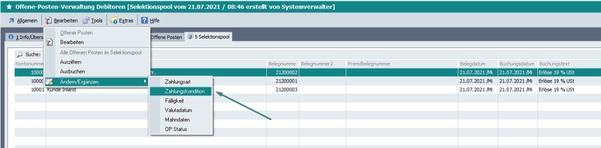 Ab Revision 67600/BETA und 67596/PATCH gibt es in der Offenen Postenverwaltung für Debitoren und Kreditoren auf Karteikarte „5 Selektionspool“ unter „Bearbeiten“ âžœ „Ändern/Ergänzen“ nun auch die Möglichkeit, die Zahlungskondition der Offenen Posten, die sich im Selektionspool befinden, zu ändern.