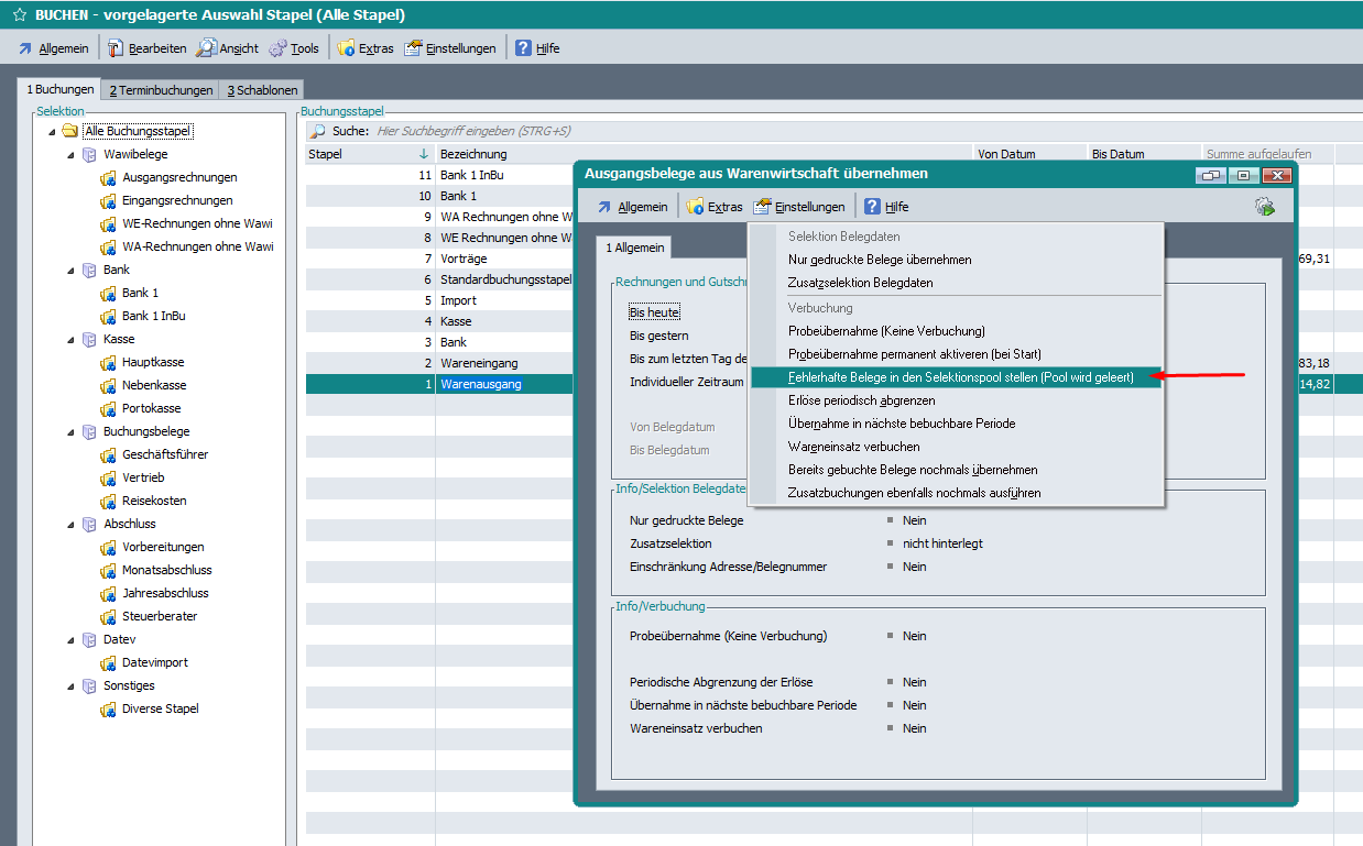 Ab Revision 68106/S.i.E. haben sie die Möglichkeit, fehlerhafte Ausgangsbelege bei der Wawi/Fibu Übergabe in den Selektionspool zu überstellen. Dazu müssen sie im Menü „Einstellungen“ die entsprechende Option aktivieren.