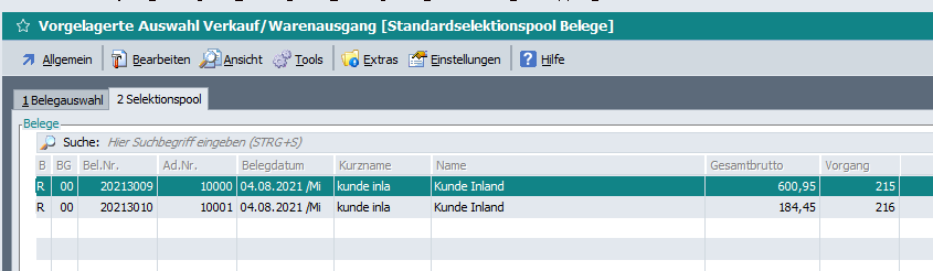 Achtung: vom selben Bediener zuvor eingestellte Belege werden aus dem Selektionspool gelöscht.