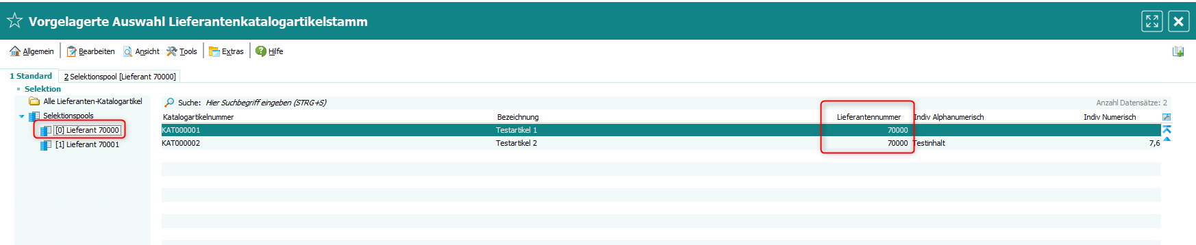 Bei den Lieferantenkatalogartikeln hat man die Möglichkeit verschiedene Selektionspools anzulegen. So kann man z.B. nach der Lieferantennummer selektieren und hat so einen Selektionspool, der einem nur die Katalogartikel eines bestimmten Lieferanten anzeigt. Wenn man das nun mit 5 verschiedenen Lieferanten macht, hat man die verschiedenen Lieferantenkataloge übersichtlich zugänglich.