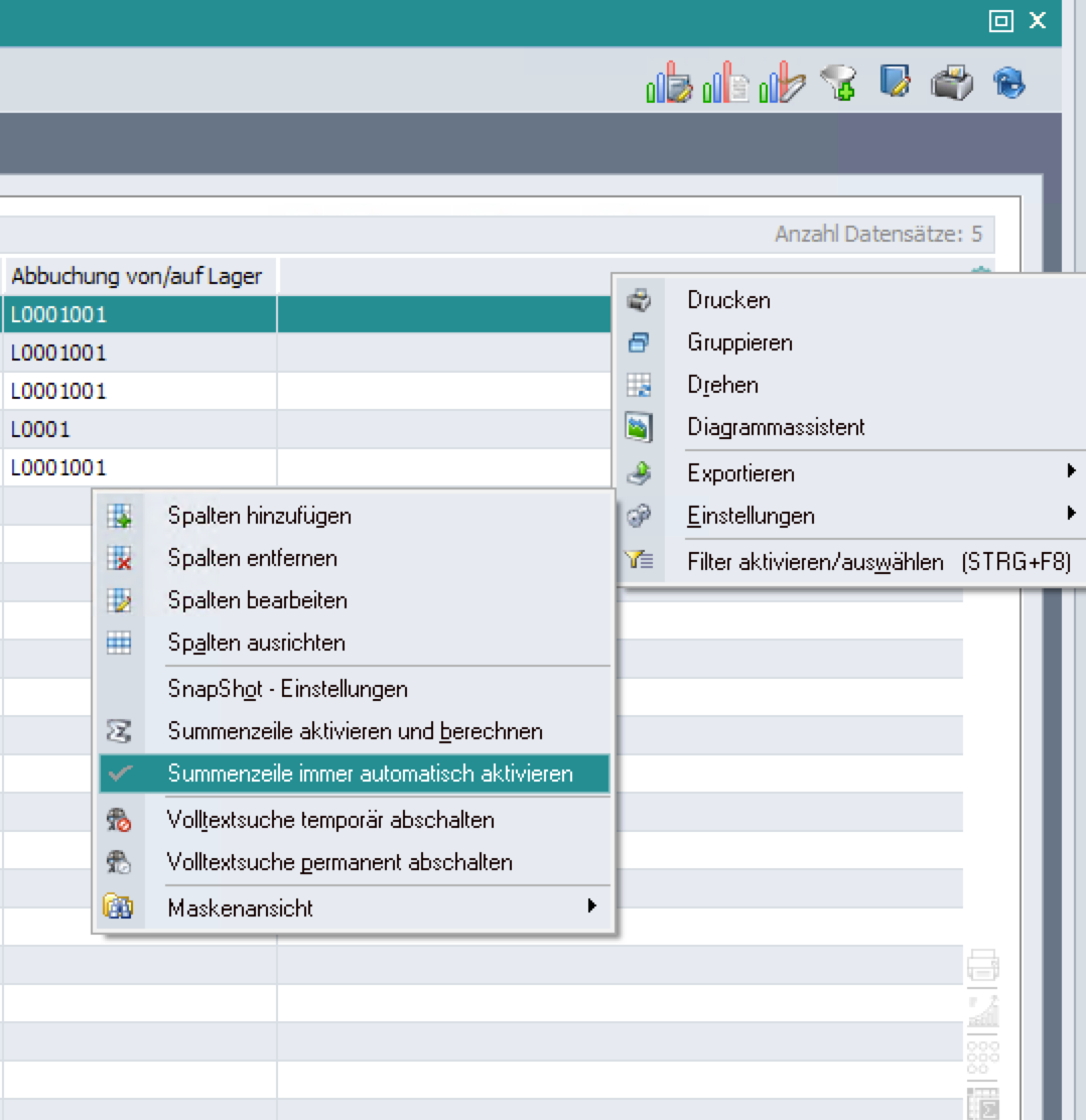 Es gibt einen neuen Eintrag im Tabellenmenü, um die Summenzeile in Hauptspeichertabellen immer automatisch zu aktivieren.