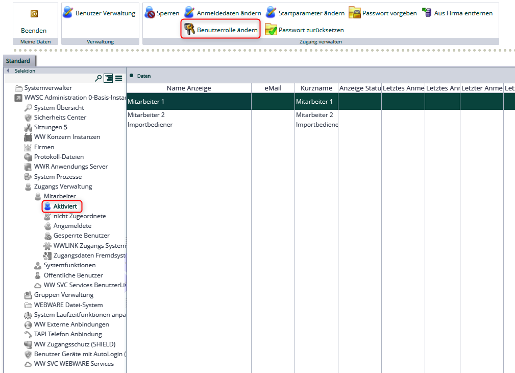 Wechseln Sie danach in des Untermenü Zugangs Verwaltung – Mitarbeiter – Aktiviert und wählen einen Bediener aus.