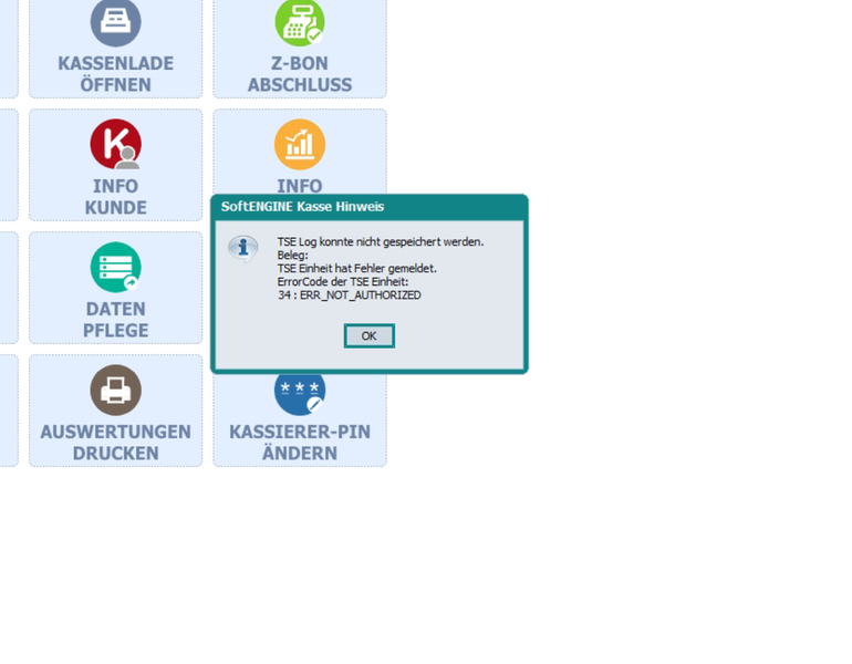 Die im folgenden beschriebenen Fehlermeldungen kommen direkt von der TSE und nicht von der SoftENGINE Kasse.