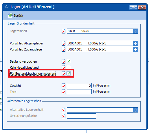 Mit dieser Programmänderung gibt es im Artikelstamm das neue Flag „Für Bestandsbuchung sperren“. Wenn dieses Flag aktiviert ist, ist dieser Artikel für Bestandsbuchungen z. B. Zubuchung, Entnahme, Umbuchung usw. gesperrt.