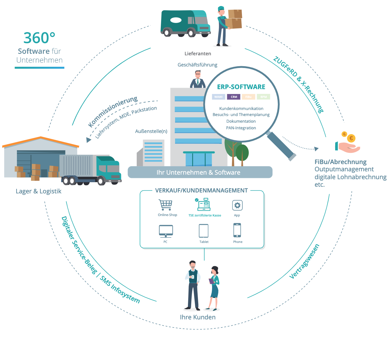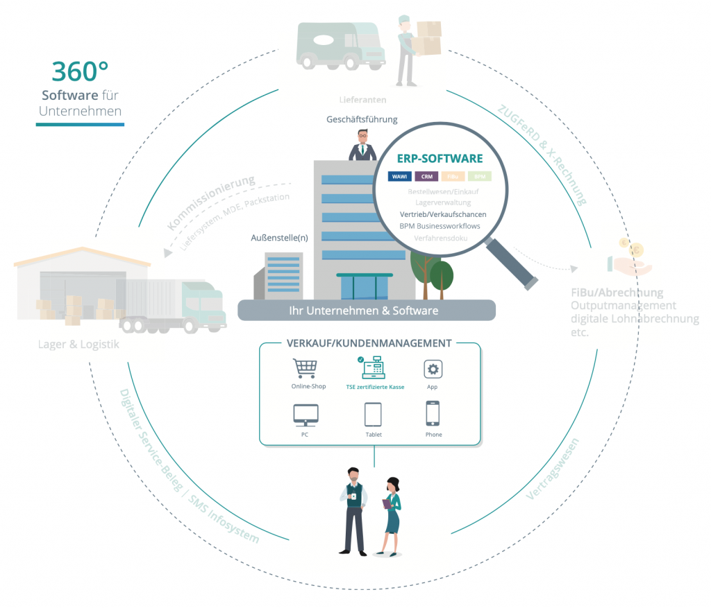 Die direkte Zusammenarbeit mit PAN und dem CRM-Modul ermöglicht es, Daten und Aktivitäten an diese Softwaremodule zu übertragen.  …
