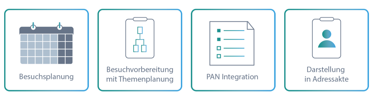 Nutzen Sie Besuchsberichte, um Besuche bei Kunden und Lieferanten sinnvoll vorzubereiten und nach einem Besuch die Ergebnisse genau zu dokumentieren. Mit einem neuen Design arbeiten Sie noch effektiver bei der Datenerfassung und werten die Berichte nach umfangreichen Kriterien aus. besonders hervorzuheben ist die direkte Verknüpfung mit PAN-Prozessen und Aufgaben.