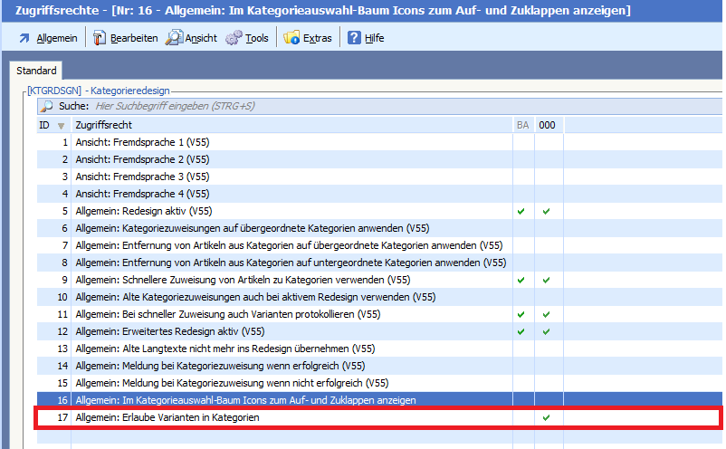 Mit dieser Programmänderung können Variantenartikel in Kategorien eingebunden werden. Hierfür gibt es ein neues Zugriffsrecht.