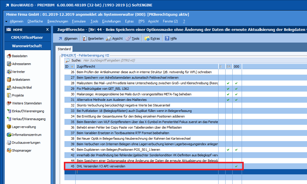 Mit dieser Programmänderung ist es möglich, mit dem Zugriffsrecht „FEHLER7,45 – DHL Versenden V3 API verwenden“, die DHL API Version umzustellen. Dieses Zugriffsrecht ist im Standard ausgeschaltet.