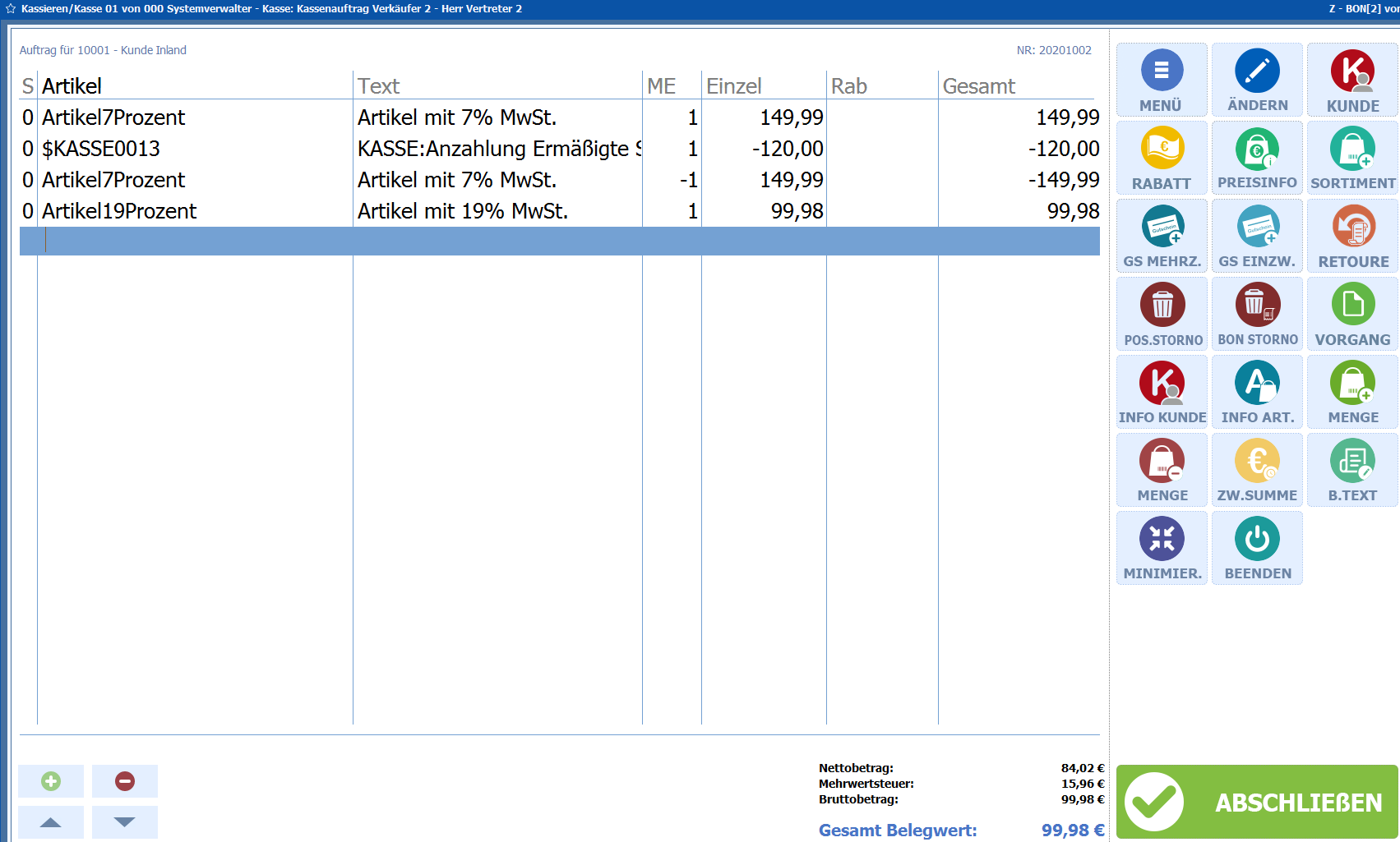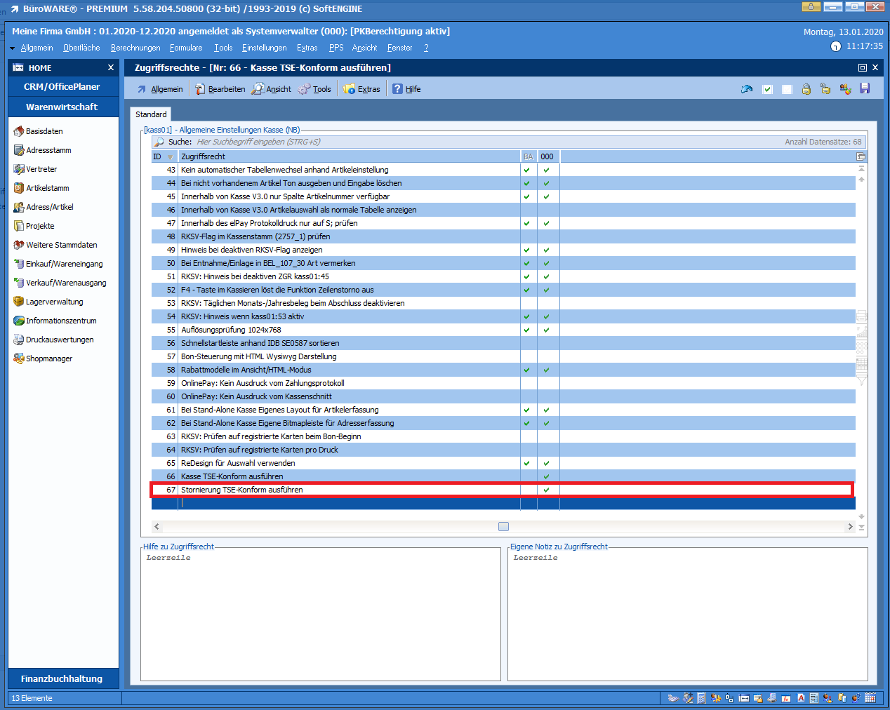 Mit dieser Programmänderung erfolgt der Storno 1:1 und nicht mehr über Artikelpositionen, wenn das Zugriffsrecht „KASS01,67 Stornierung TSE-Konform ausführen“ aktiviert ist.