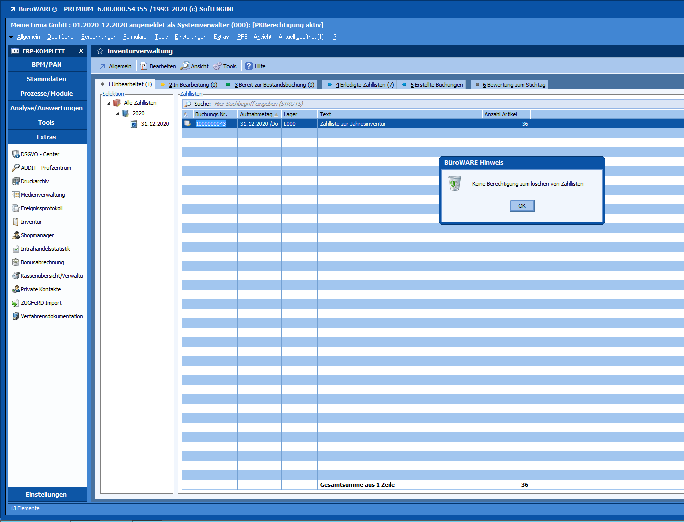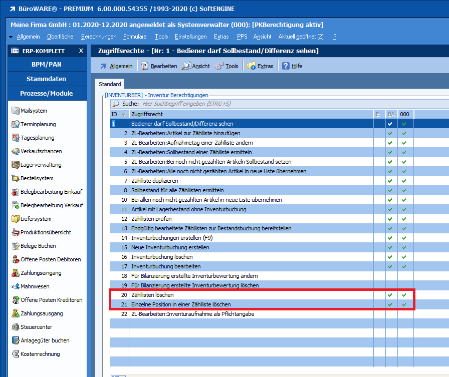 Mit dieser Programmänderung steht ein neues Zugriffsrecht für Inventurberechtigungen zur Verfügung, welches standardmäßig aktiviert ist: