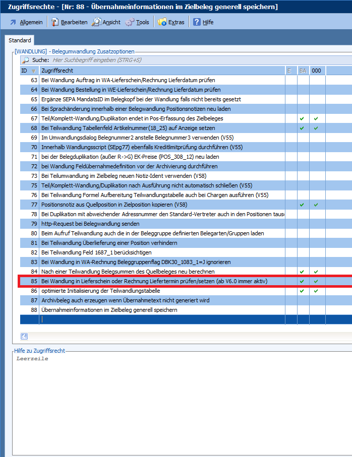 Mit dieser Programmänderung gibt es das neue Zugriffsrecht „WANDLUNG,093 – K-Zeilen bei Teilwandlung immer automatisch markieren“. Wenn das Zugriffsrecht aktiv ist, werden alle K-Zeilen aus dem Quellbeleg bei einer Teilwandlung automatisch markiert.