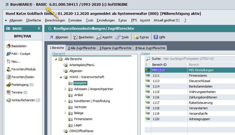 Mit der Revision r50600 haben wir ein Problem in der Beta behoben, wo nach dem Entfernen des unten angegebenen Zugriffrechts, die Anzahl der Mandanten nicht mehr korrekt ausgelesen wurde (Die BüroWARE ist nach der Mandantennummer und nicht nach der tatsächlichen Anzahl der Mandanten gegangen).